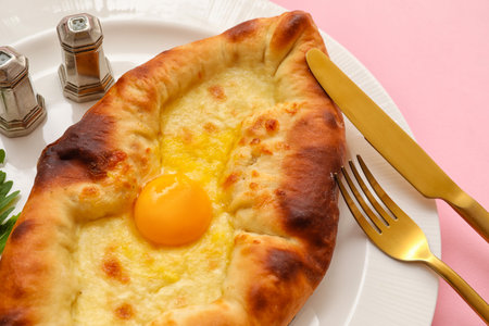 Plate with tasty Ajarian khachapuri on pink background, closeup