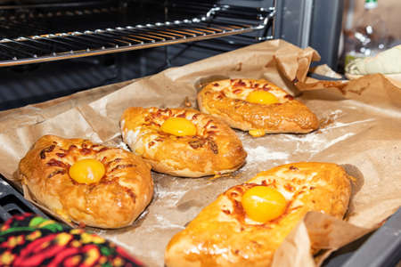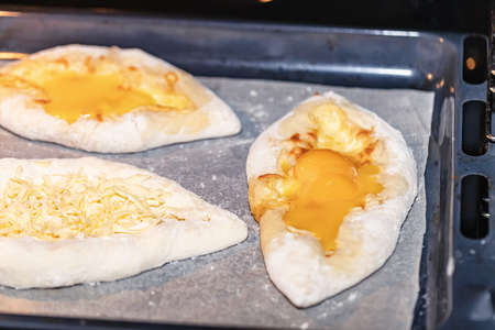 Cooking traditional Caucasian flatbread with cheese and egg in the oven