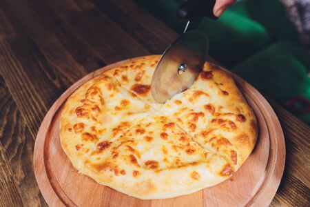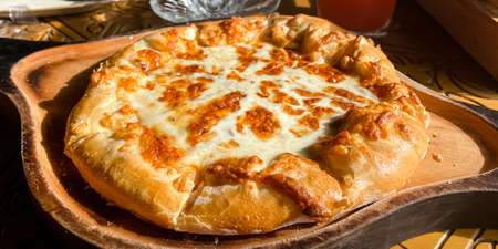 Mingrelian or megruli khachapuri is traditional Georgian cuisine meal. Baked bread with cheese filling. National pastry snack