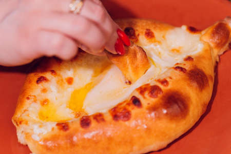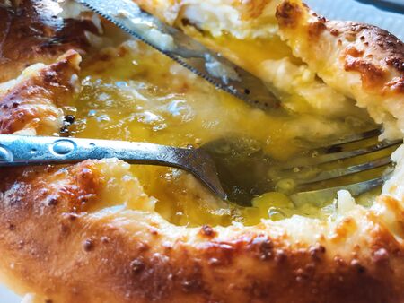 Ajar traditional khachapuri. National Georgian cuisine. Khachapuri closeup.