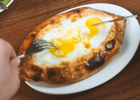 nourishing adjarian khachapuri recipe. fatty delicious unhealthy food. georgian cuisine