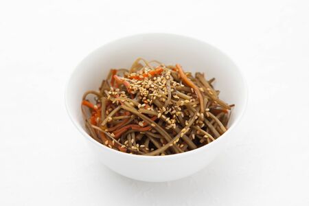 Kinpira gobo, chopped burdock root and carrot cooked in sugar and soy sauce
