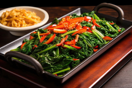 stir-fried kale and spinach served on a copper tray, created with generative ai