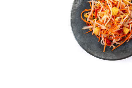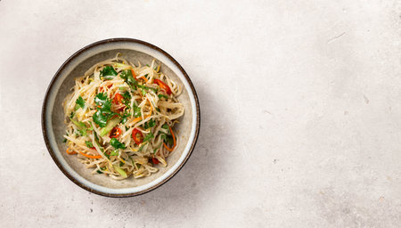 Stylish japchae photoreportage vibrant glass noodle and vegetable dish on white background