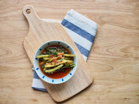 Traditional Korean kimchi snack: cucumbers stuffed with carrots, green onions, garlic and sesame, fermented vegetables, light background, horizontal format