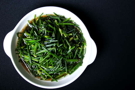 Stir fried Chinese chives flowers on white dish and black background. Top view..