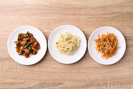 Korean side dish, Mung bean sprouts salad and kimchi cucumber, Table top view