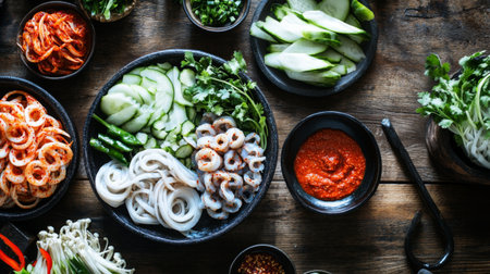 A vibrant array of fresh ingredients showcases a mix of vegetables and seafood on a rustic wooden table, perfect for culinary preparations in Asian cuisine.