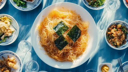 A top-down view of a dinner table set with crispy seaweed-wrapped glass noodles and various side dishes, creating a colorful and appetizing atmosphere for a meal.