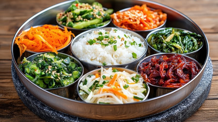 Delicious variety of pickled vegetables and rice served traditional dish, showcasing vibrant