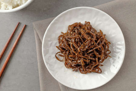 Delicious spicy stir fried squid on a plate, Banchan, Korean food