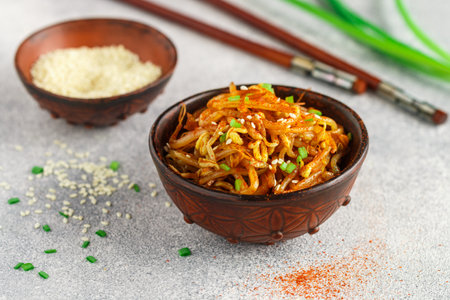 Spicy mung bean sprouts salad with garlic, sesame seeds, green onions, soy sauce, spices and red pepper. Kongnamul Muchim. Traditional Korean dish. selective focus