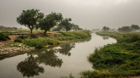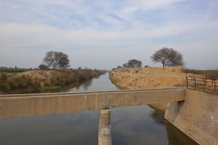 rural Punjabi landscape with irrigation canal and concrete channels to provide water for the intensive agriculture of the region.