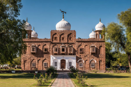 A symmetrical brick building features multiple white domes and minarets under a clear blue sky. The architectural structure exhibits arched windows and doors, with a white-painted entrance. The daytime image shows the building situated within a green, well-manicured landscape. Suitable for commercial use or depicting cultural heritage.