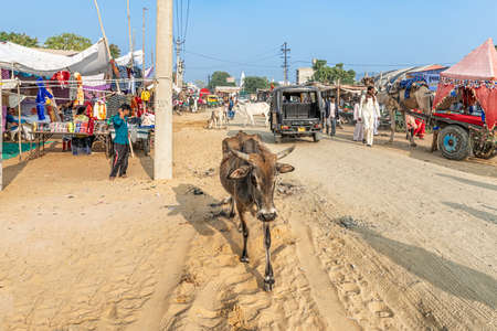 Pushkar, India – November 15, 2018: view at the road with shop stands, Cows and people walking at the Annual Pushkar Cattle fair in Pushkar, Rajasthan, India.
