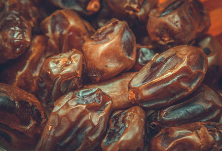 Dried fruits background, dried dates close-up, selective focus, toned picture