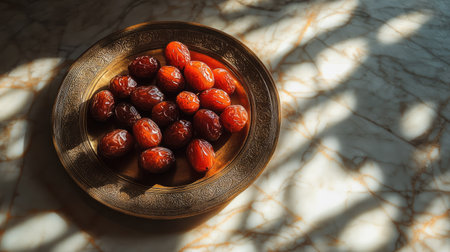A vibrant composition featuring fresh dates arranged on a decorative plate, showcasing their natural sheen against a marble background with intriguing shadows.