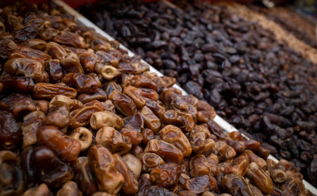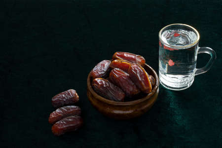 Ramadan dates is traditional food for iftar in islamic world. Dark background