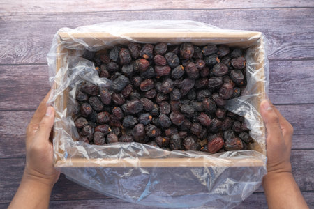 Close up of raw dried dates,Phoenix dactylifera in a traditional bowl on a wooden surface.