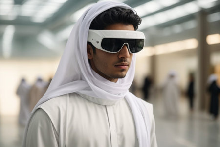 Handsome young Muslim man wearing virtual reality goggles in the mosque
