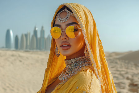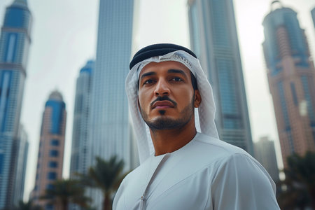 Arab man in traditional clothing stands confidently with arms crossed, featuring detailed embroidery, set against a backdrop of modern architecture, embodying cultural heritage