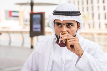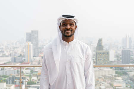 Beautiful middle eastern man wearing kandora traditional outfit in Dubai. Portraits in the emirates