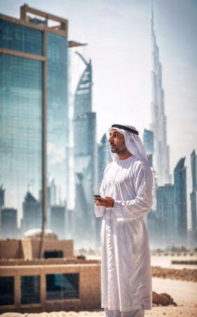 rich arab businessman in Traditional White Outfit in big city in background, generative AI