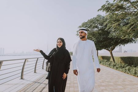 Traditional arab couple wearing emirati clothing - Middle-eastern married woman with abaya and man with kandura meeting and having fun in the city