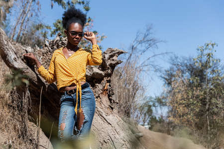 portrait of beautiful young black woman with yellow shirt and sunglasses observing nature in a park, concept of nature, social distancing and portrait
