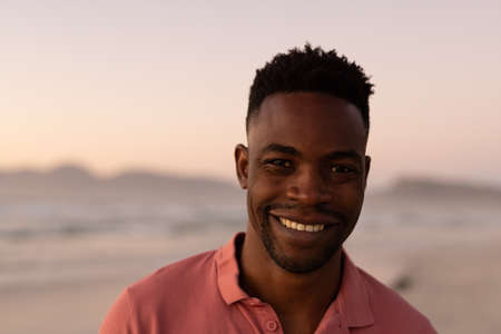Close-up portrait of smiling african american young man at beach against clear sky during sunset. nature, copy space, unaltered, beach, lifestyle, enjoyment and holiday concept.