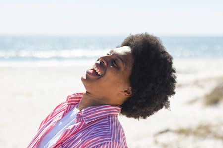 A young African American man enjoys the sunshine at the beach. His laughter and relaxed posture convey a sense of freedom and joy in the outdoor setting unaltered.