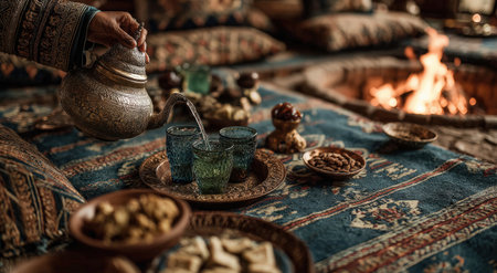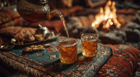 Individual pours tea into decorative glasses in a vibrant setting, with rich textiles, snacks, and a glowing fire, evoking warmth and hospitality
