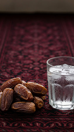 Water and dates. Iftar is the evening meal. View of decoration Ramadan Kareem holiday on carpet. Festive greeting card, invitation for Muslim holy month Ramadan Kareem. Selective focus
