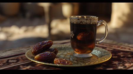 Ornate teapot pours tea into glass cups, surrounded by dates and nuts on a vibrant textile, evoking a cozy and inviting ambiance of cultural tradition