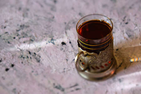 Eastern black tea in glass at the forest. Eastern tea concept. Armudu traditional cup. Green nature background. Selective focus