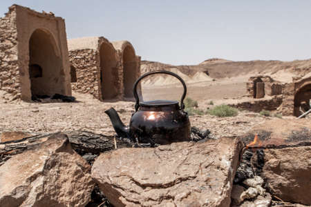 Tea kettle on campfire in iranian desert Dasht-e Kavir near abandoned village.