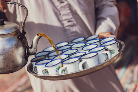 Bedouin man pouring tea from a metal teapot into traditional small cups, during a ceremony in the Marsa Alam desert, Egypt