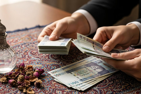 Hands counting new Eidi banknotes on a decorated surface with rosewater and flowers creating a cultural celebration moment.