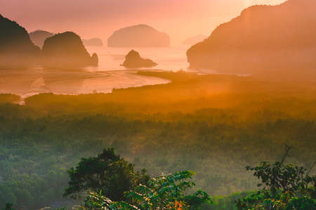 Mountain view sunrise of Phang Nga Bay at Samet Nang She Viewpoint, Phang Nga, Thailand. The famous landmark and famous travel destination.