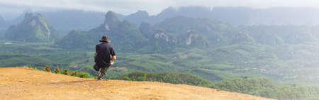 A photographer photographs a beautiful view from the Samet Nanghse observation deck in Thailand. Magnificent mountain landscape for lovers of landscape photography, tourists and travelers