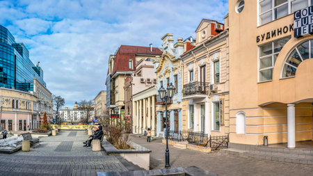 Minsk/Belarus - September 5, 2019 Zybickaya Street of the upper town in Minsk Downtown. Architecture, Street view, people, city life