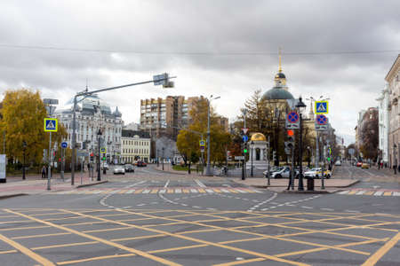 Moscow, Russia - 23 Jul 2020: General landscape view at tradition Moscow architecture. City life on the central streets of the city. The citizens go on their own business. Automobile traffic.