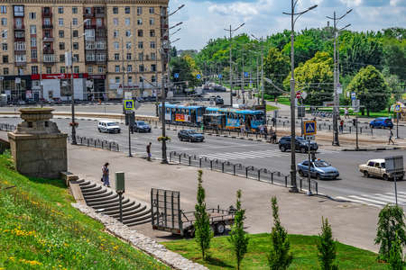Kharkiv, Ukraine - July 20, 2020: Summer cityscape of Kharkov on Serhiyiskyi Square. City panorama with old tram, cars on the road and pedestrians on a sunny day