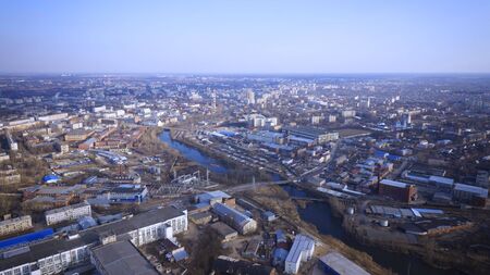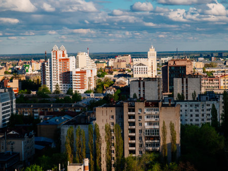 Evening summer Voronezh cityscape, aerial view.