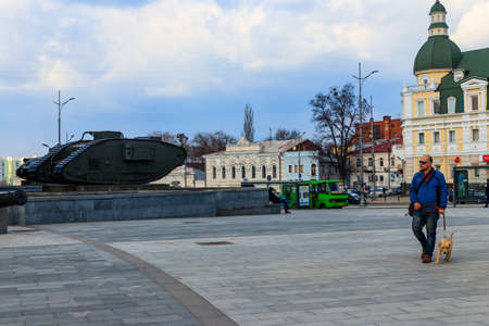 Kharkov, Ukraine - April 5, 2021: Young man with labrador puppy walking on Constitution Square in Kharkiv, Ukraine
