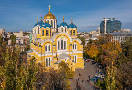 Aerial view from a drone of St. Andrew's Church in Kiev in autumn at sunset outdoor