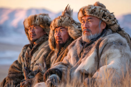 Three mongolian eagle hunters wearing traditional fur clothing are sitting side by side in a field at sunset