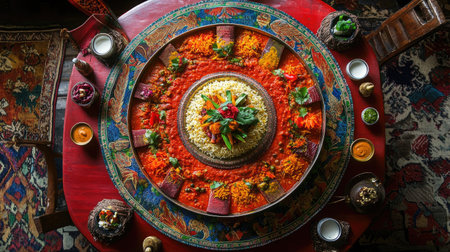 Overhead view of a colorful thali featuring various Indian dishes like biryani, dal, and vegetable curry, beautifully arranged on a traditional platter