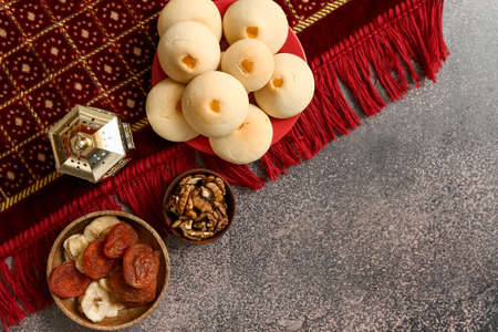 Tasty Eastern sweets with fanoos lamp and carpet on dark background