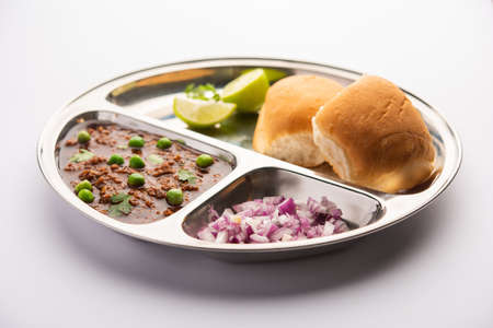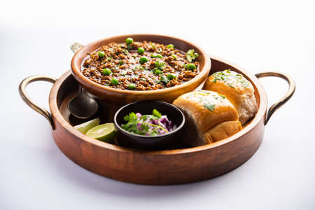 Indian Masala Kheema Pav or khima or Dry Spicy Minced Meat usually served with indian flat bread called kulcha/roti/chapati, garnished with green peas. Selective focus